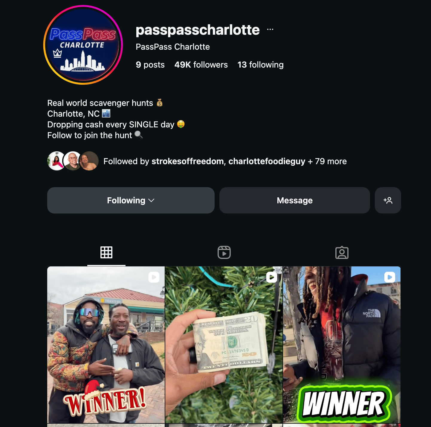 If you’ve been scrolling Instagram lately, you’ve probably noticed a surge of accounts promising “pop-up cash drops” around Charlotte — with handles like @passpasscharlotte, @findthecashchar, and similar variations. These pages tease real-life scavenger hunts with daily cash drops at random locations. Once the spot is revealed, people race to be the first to grab the money. One recent reel even claimed they’d be “dropping cash every day around the city.”
